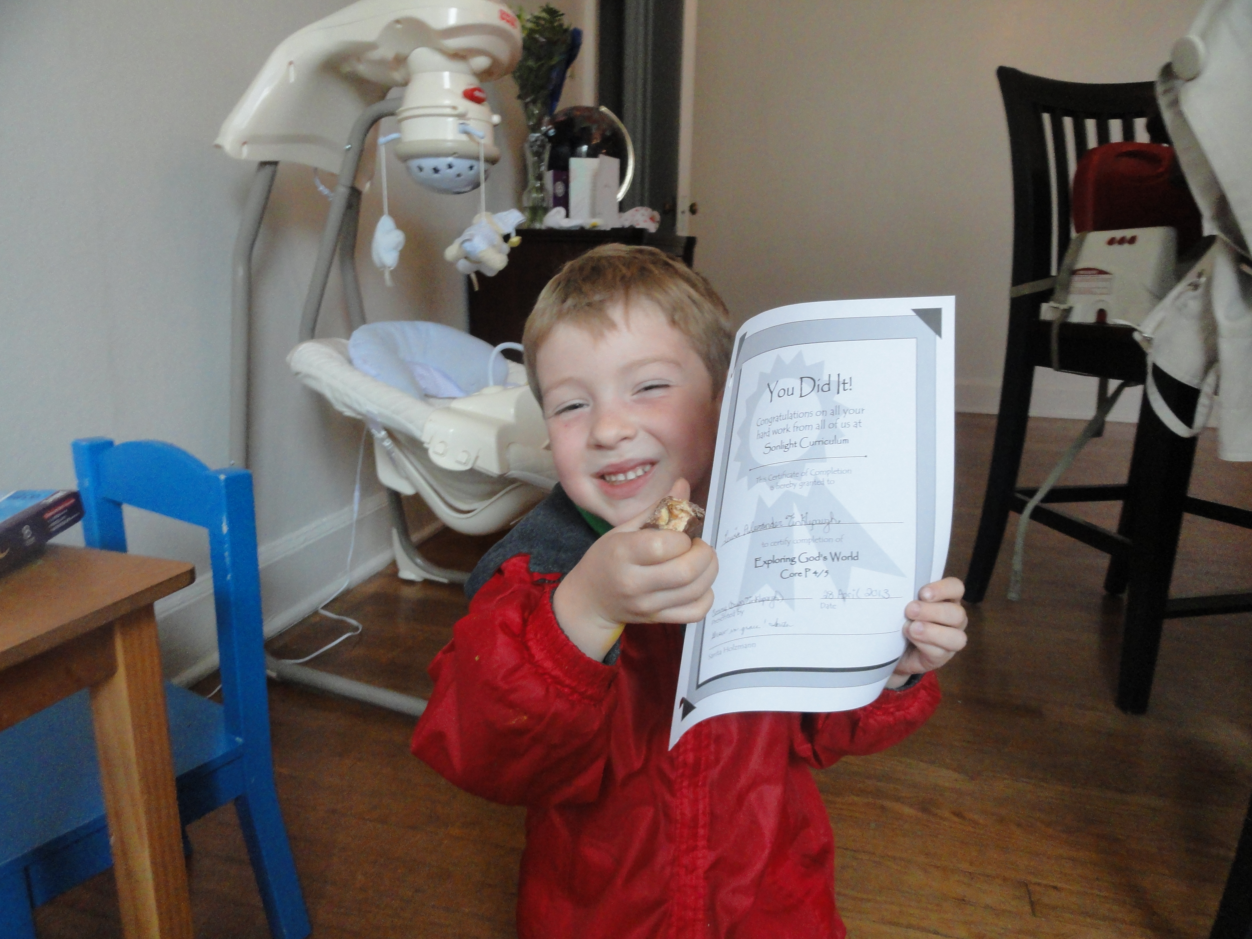Wow, I cannot believe all the HARD work this little boy has been doing! He is not just flying, he is SOARING into the sky! As I reflect on this past year of his life, he has learned SO much and has had so many transitions. In the past year, he has completed his first year of preschool at home with me, memorized and completed a whole year worth of AWANA verses in half a year, learned to swim quite a ways on his own, and lately, he’s grown tremendously emotionally and socially, starting official preschool. His teacher said he’s doing fantastic now!!! His wonderful teacher explained to me as he grows socially and emotionally and matures, the rest of the areas of academia that are harder for him will all of a sudden fall into place. I cannot say enough wonderful things about his teacher, but one of the things I love the most about her is that she loves to be a team with me. We put our heads together at Lewis’ first evaluation at preschool, about 2 weeks into it, and came up with a plan together. We implemented that plan and it worked BEAUTIFULLY. It was a grueling 3 weeks of holding the line for both of us, but we put forth strong hearts and helped Lewis move forward. We fostered a little separation from his “partner-in crime,” Hannah, and encouraged more time with kids his age and older. His tantrums are calming and are much fewer in number now. I remember the day that the few weeks of strong defiance broke into tears…and shortly after that, came willing compliance 🙂 We made it and he is really soaring now on his own.